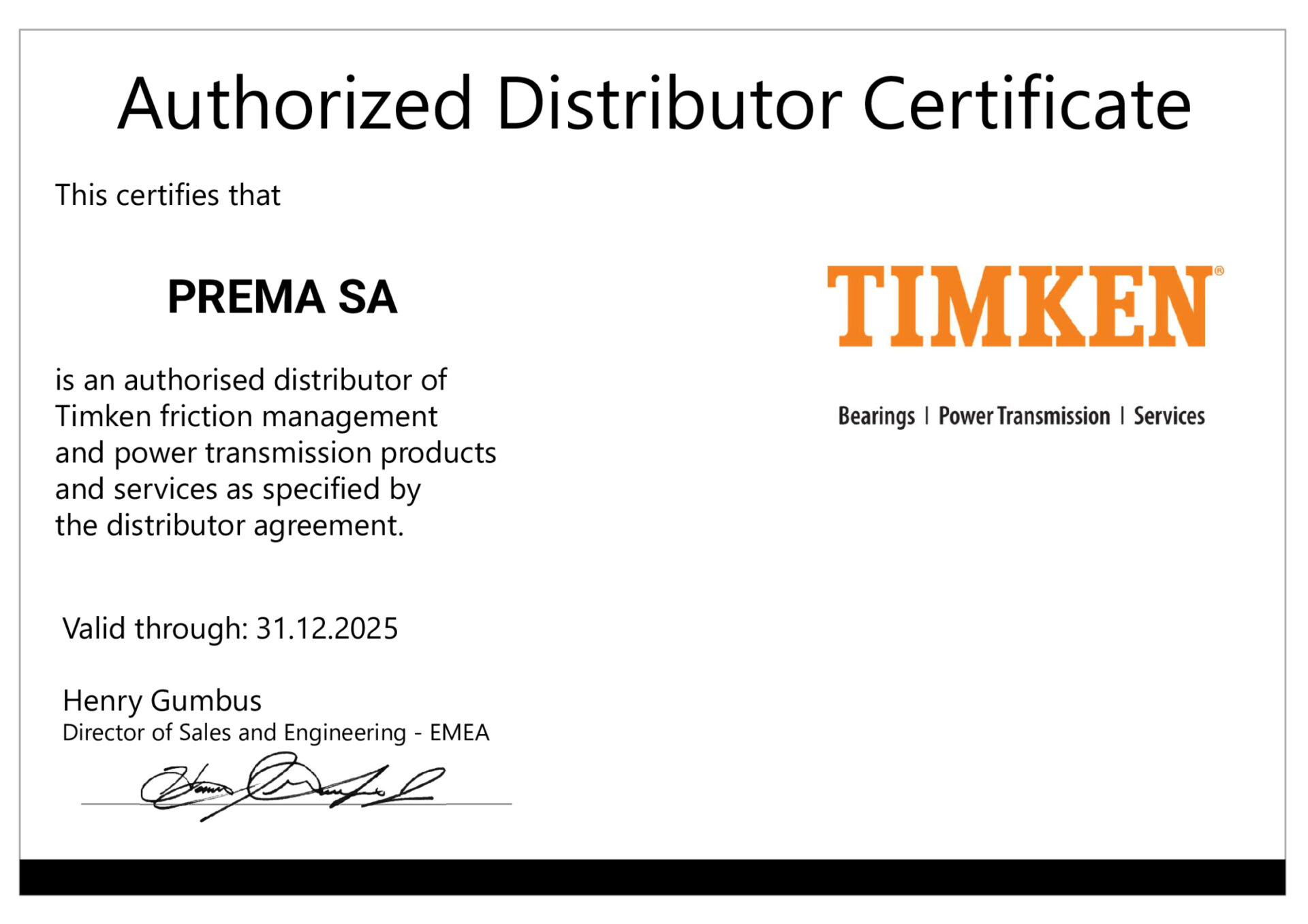 PREMA SA dysponując odpowiednim potencjałem i zespołem wykwalifikowanych pracowników, posiada i uzyskuje kolejne certyfikaty autoryzacyjne świadczące o wysokim poziomie obsługi rynku, pozwalające na posługiwanie się w swobodny sposób markami znanymi na całym świecie. Certyfikaty autoryzacyjne gwarantują naszym klientom pełną wiarygodność oferowanych towarów, świadomość właściwego doboru i bezpieczeństwo późniejszej ich bezawaryjnej eksploatacji.